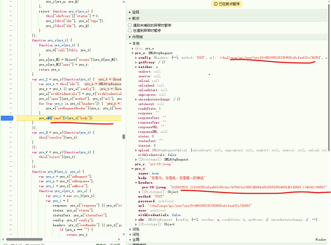 可以发现,传入参数和headers请求头里面有加密参数的痕迹,需要去逆向分析yrx15和yrx-15-jsvmp的生成逻辑,加密参数一定会在send之前生成,所以可以跟踪启动器,一步步跟栈,看作用域来找