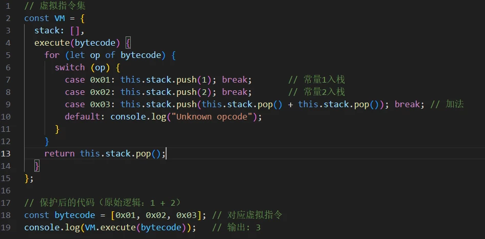 自定义指令集:替换原生JS操作码为虚拟指令。