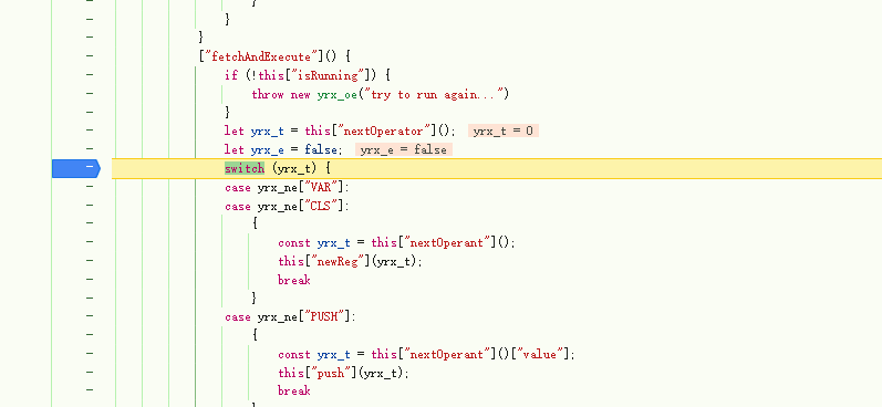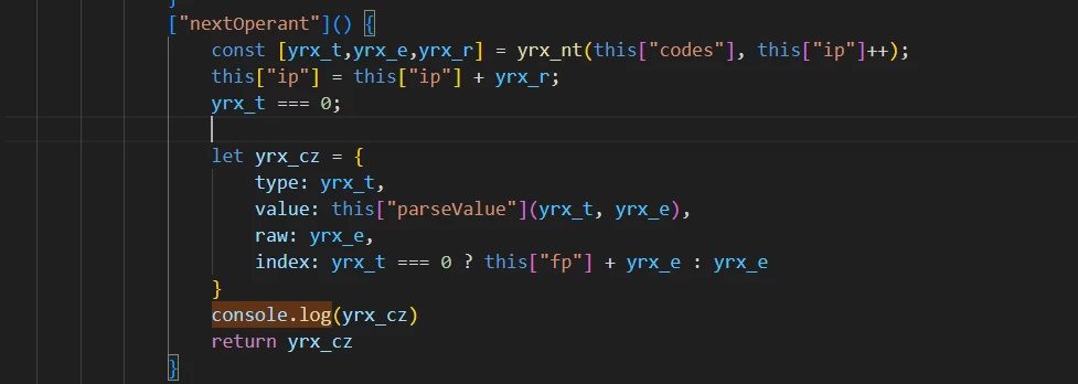 在这里你会发现无论怎么跳转下一个函数最终都会回到这里,这里也符合最开始所述的jsvmp的特征,这里我们需要通过插桩的方法来推测代码的执行结果,通过比对发现this[“nextOperant”]在case中频繁的出现,因此我们可以进入该方法然后进行插桩,同时进入该function我们可以看到type,value,raw,index等信息,这些能更好的帮助我们分析理解代码逻辑