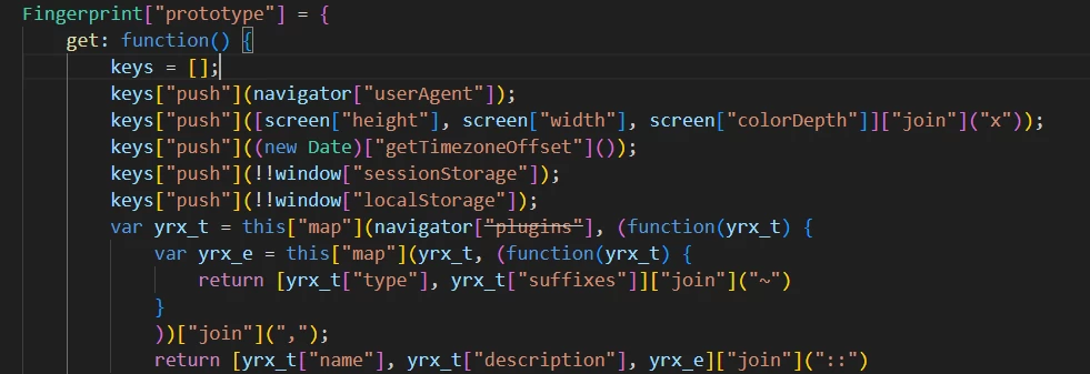 左边是浏览器的插桩输出,右边是本地的插桩输出,可以发现在1688行这里出现了差异,然后往上一看可以发现是调用fingerprint_getfp这里出现了问题,进入代码可以发现问题。 代码调用了window.localStorage和sessionStorage,构造好这两个即可,然后再次比对可以先后找出navigator.plugins,navigator.webdriver,navigator.language等环境检测。 注:node版本尽量降低至18,作者原先node环境22,发现navigator.webdriver和userAgent在高版本中不能被修改,并且navigator似乎也有一些问题,被重写了好像。